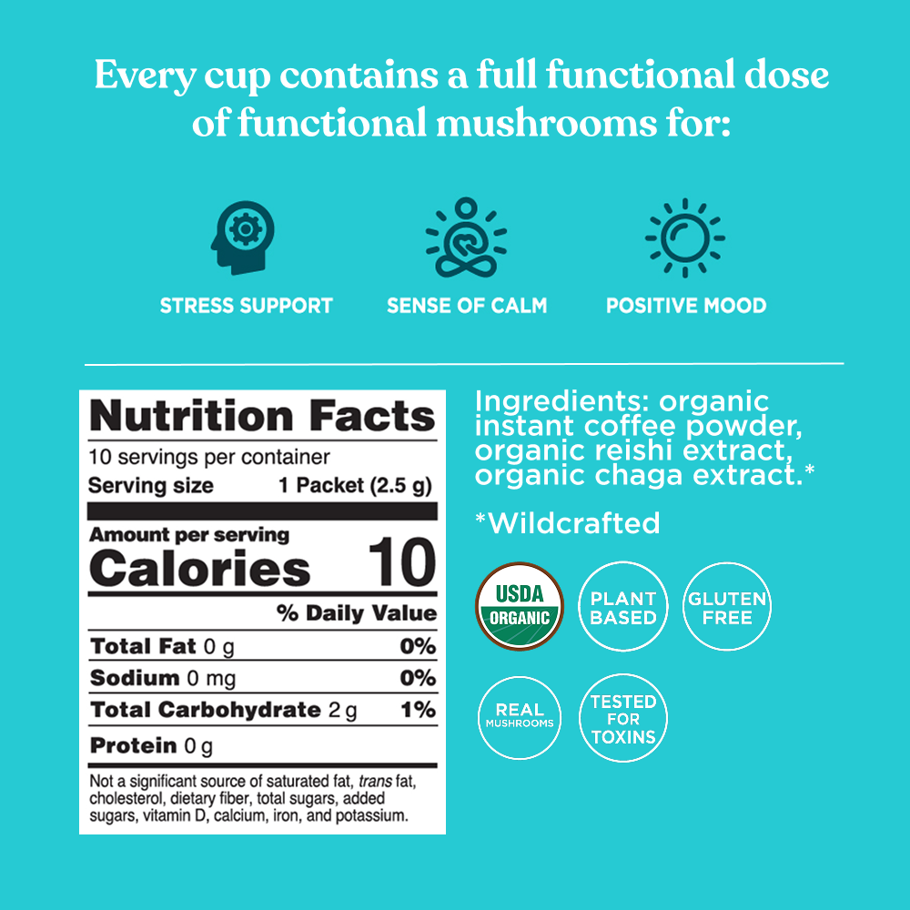 Delicious organic instant Arabica coffee infused with reishi and chaga mushrooms for stress and mood support.