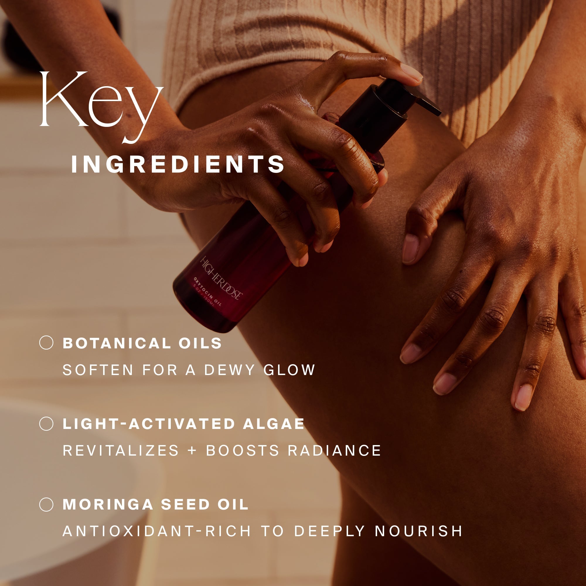 Uncover the secrets of our Ayurveda inspired Ritual Body Oil, a clinically proven formula that instantly enhances skin elasticity and delivers deep moisturization. Immerse yourself in a rush of antioxidant-rich hydration that softens, nourishes, and firms, providing a toned and sculpted appearance. This botanical rich and non-greasy body oil offers a grounding aromatherapy experience, elevating every inch of your body and senses. Transform your skincare routine with a ritual that mineralizes, moisturizes, and leaves you with a radiant glow. Perfect follow up to dry brushing, post shower or any HIGHERDOSE ritual.