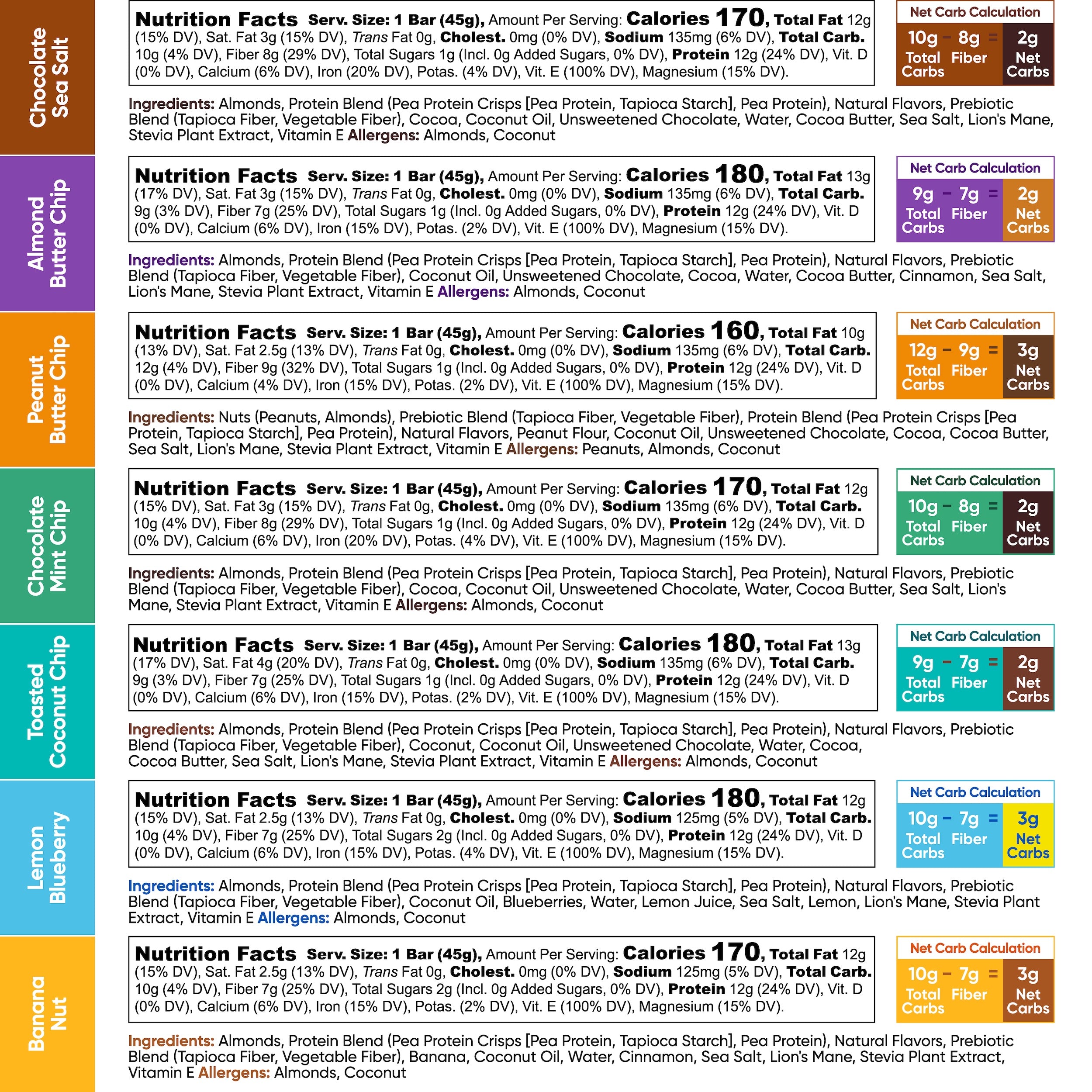 This pack includes 1 bar of all 7 of our flavors (Chocolate Sea Salt, Peanut Butter Chip, Almond Butter Chip, Chocolate Mint Chip, Toasted Coconut Chip, Lemon Blueberry and Banana Nut). It's a risk-free way to try everything we've got to offer!