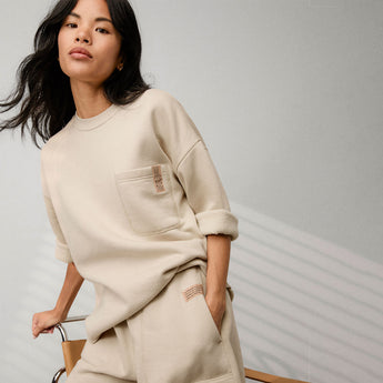 Two looks. One sweatshirt. This reimagined take on our Silksweats™ short sleeve silhouette features a 2-in-1 fully reversible design: One side smooth, the other sherpa-soft texturing. Crafted from our proprietary Silksweats™ blend of Washable Silk and breathable cotton, it’s designed with a drop shoulder for an even more laid-back fit, cropped 3/4 sleeves that roll to reveal the plush interior, and a raw edge finish that keeps things effortlessly undone. Our new longer length gives it added styling range, while the single pocket (with our signature branded tag) gives you that viral Silksweats™ look. Pairs perfectly with Silksweats™ Midweight Reversible Short.
