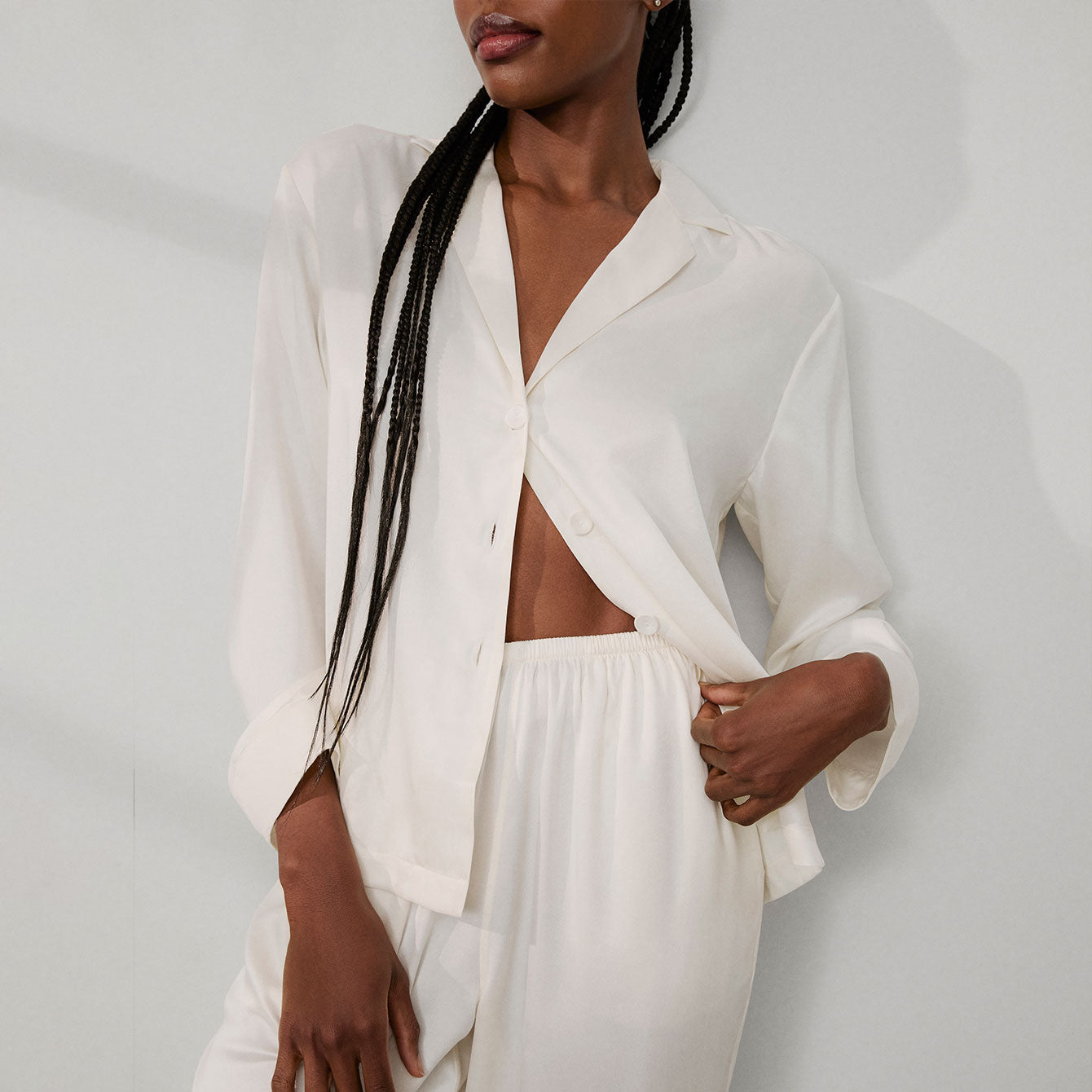The popular Washable Silk Long Sleeve Pant Set, reimagined. Same effortless feel, now with a refined, more flattering fit. Our updated silhouette is slimmer through the body and shoulders for a sleeker drape, with a new thin waistband inspired by our Jogger Pant Set for a clean, minimal finish. We’ve also added side seam pockets; subtle, functional, and exactly where you want them.