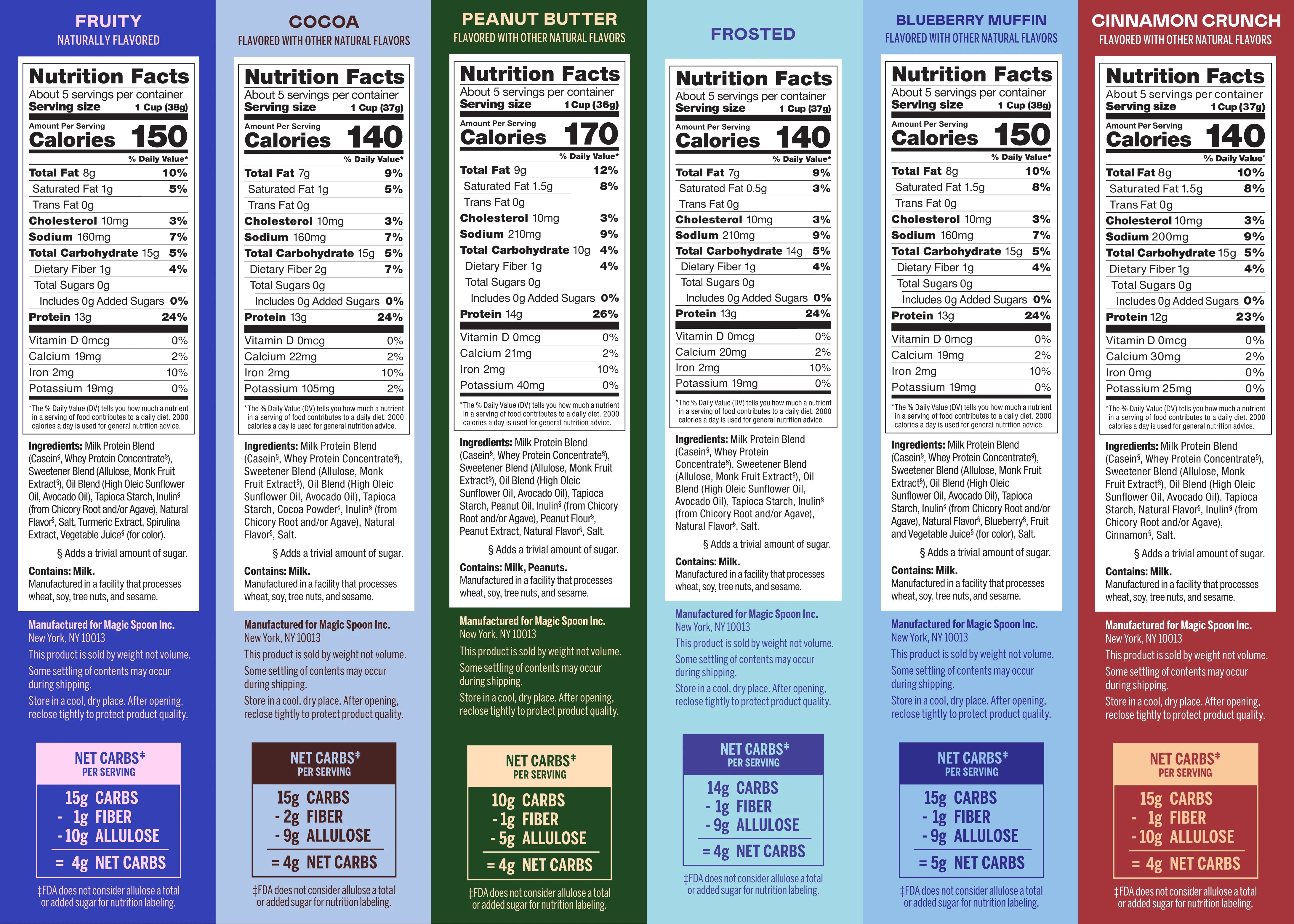 Try all of our classic flavors—Fruity, Frosted, Cocoa, Peanut Butter, Blueberry Muffin, and Cinnamon Crunch. We’ve reimagined all your favorite childhood cereals.
