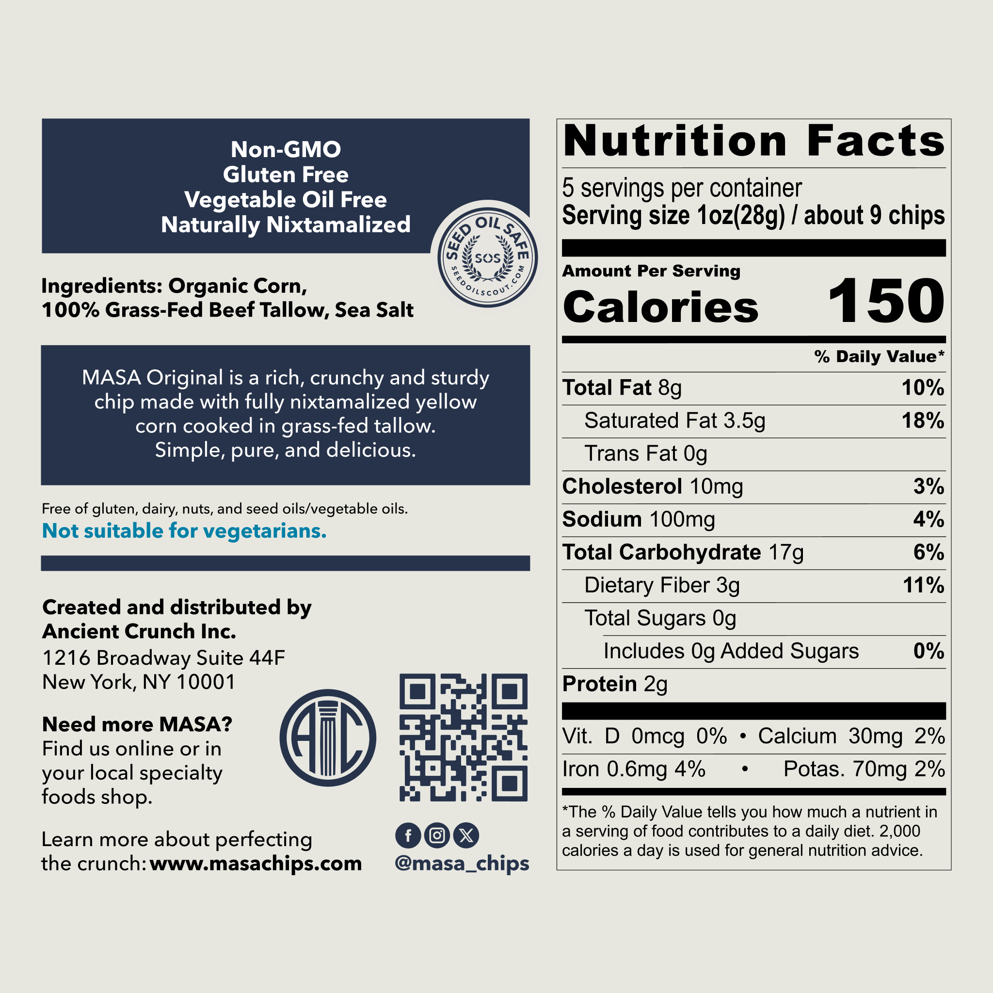 MASA Original are classic tortilla chips handmade with only three natural ingredients— organic corn, grass fed tallow, and sea salt.