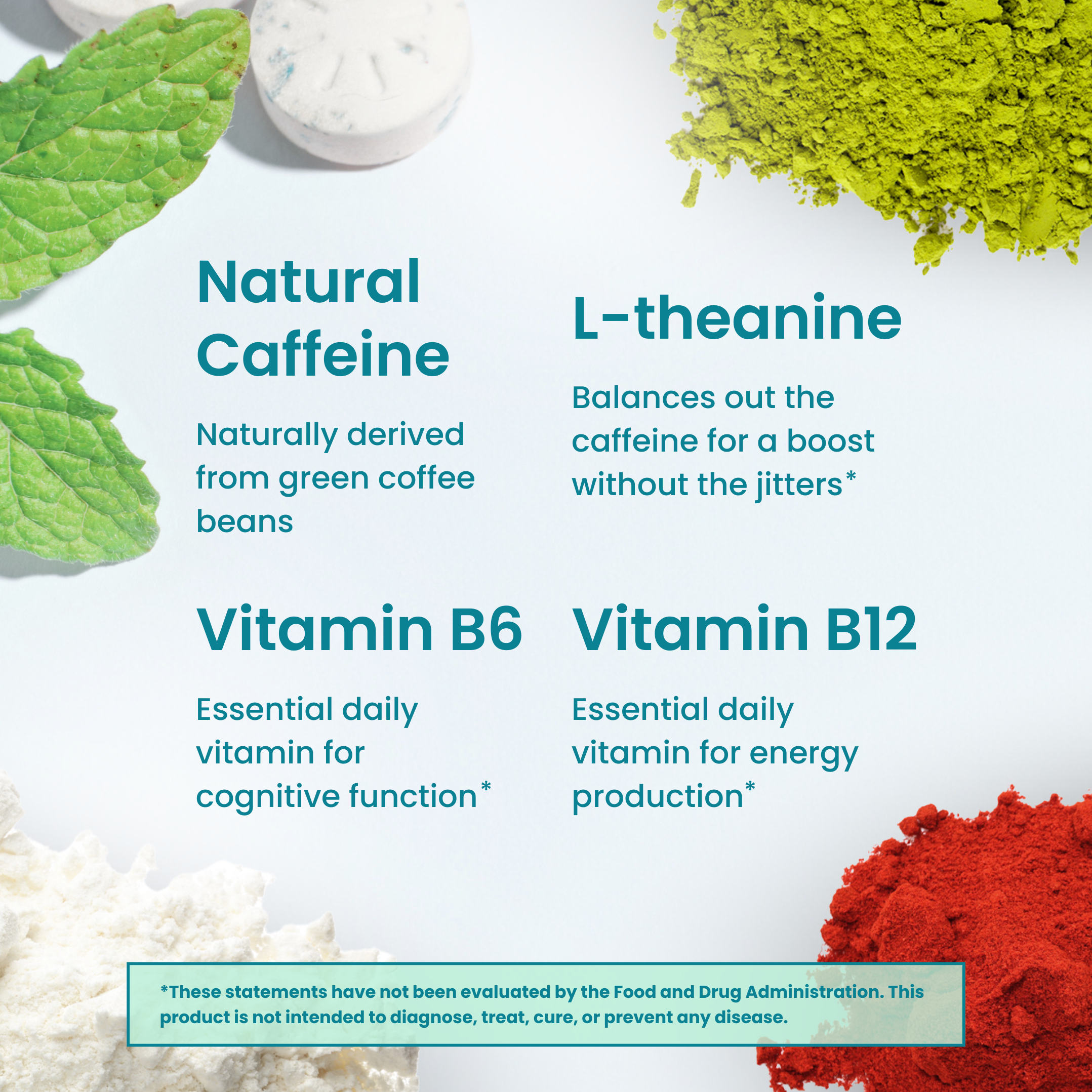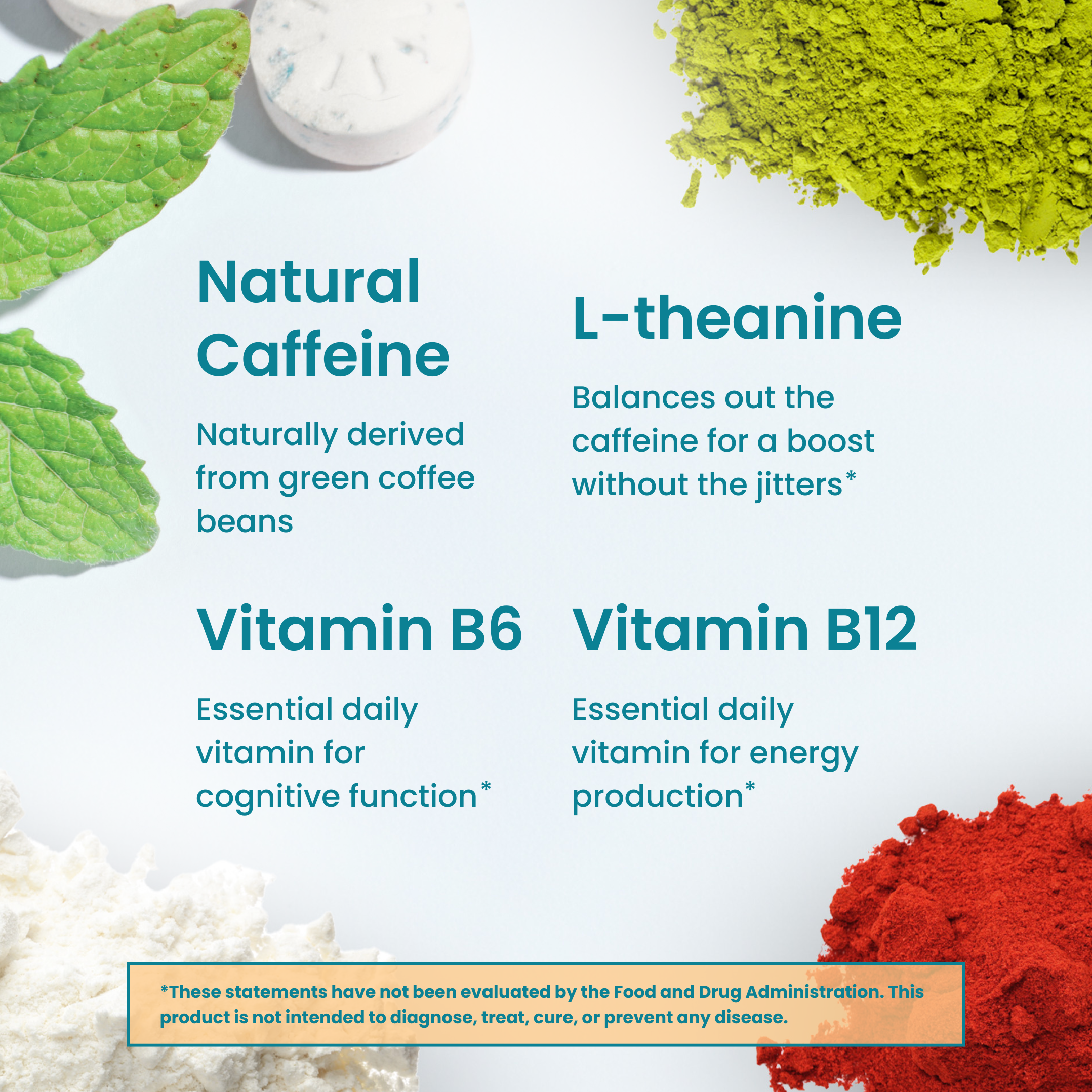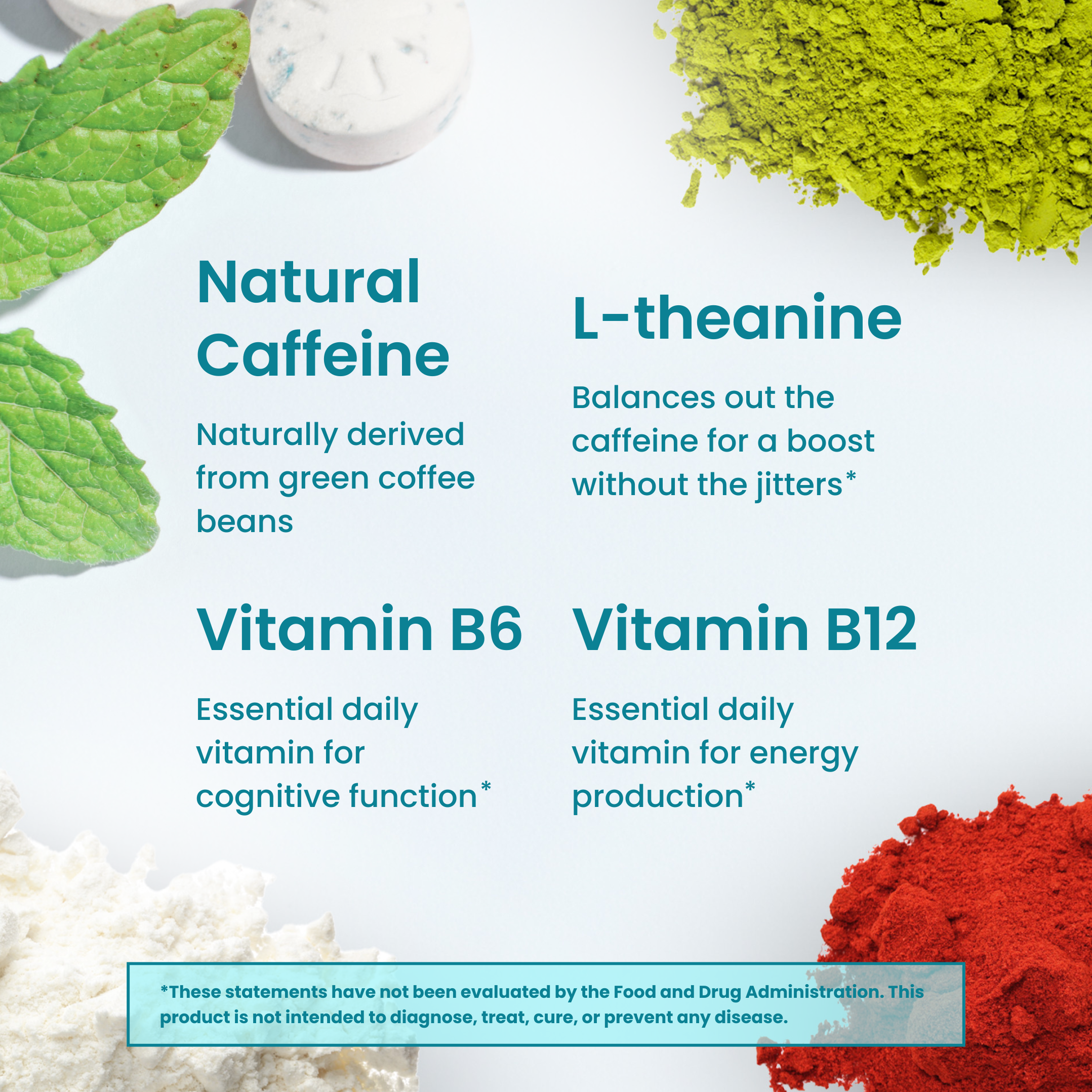 Each piece of this brain supplement contains natural caffeine, L-theanine, and essential B vitamins to fuel your brain without the crash. Designed as a portable focus supplement, this healthy gum supports concentration, mood regulation, and mental focus with no sugar or aspartame.