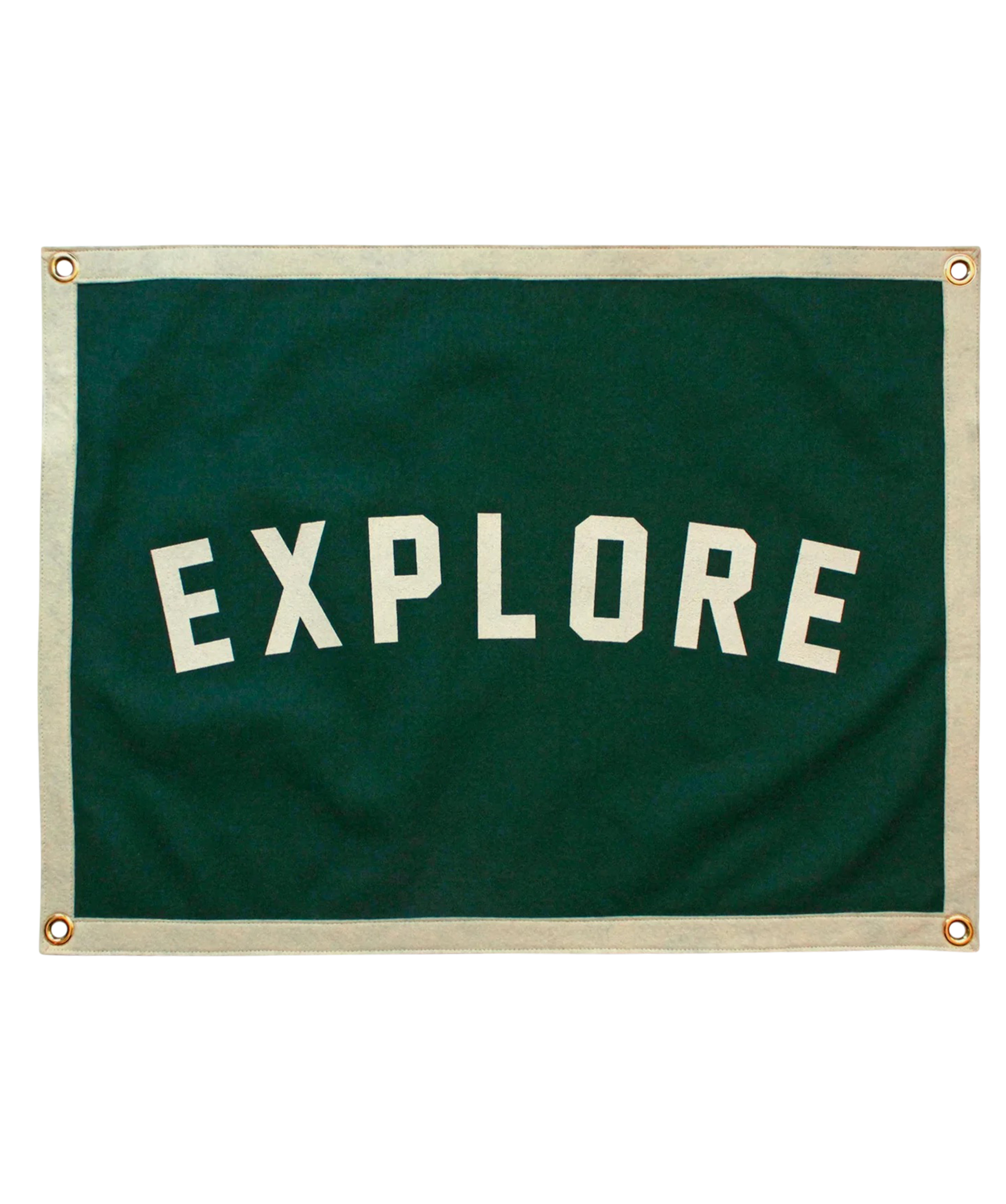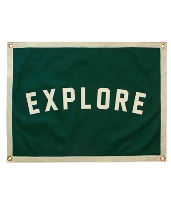 This forest green and cream Explore camp flag is perfect for explorers, campers, travelers, adventurers, lovers of the outdoors and sufferers of wanderlust.