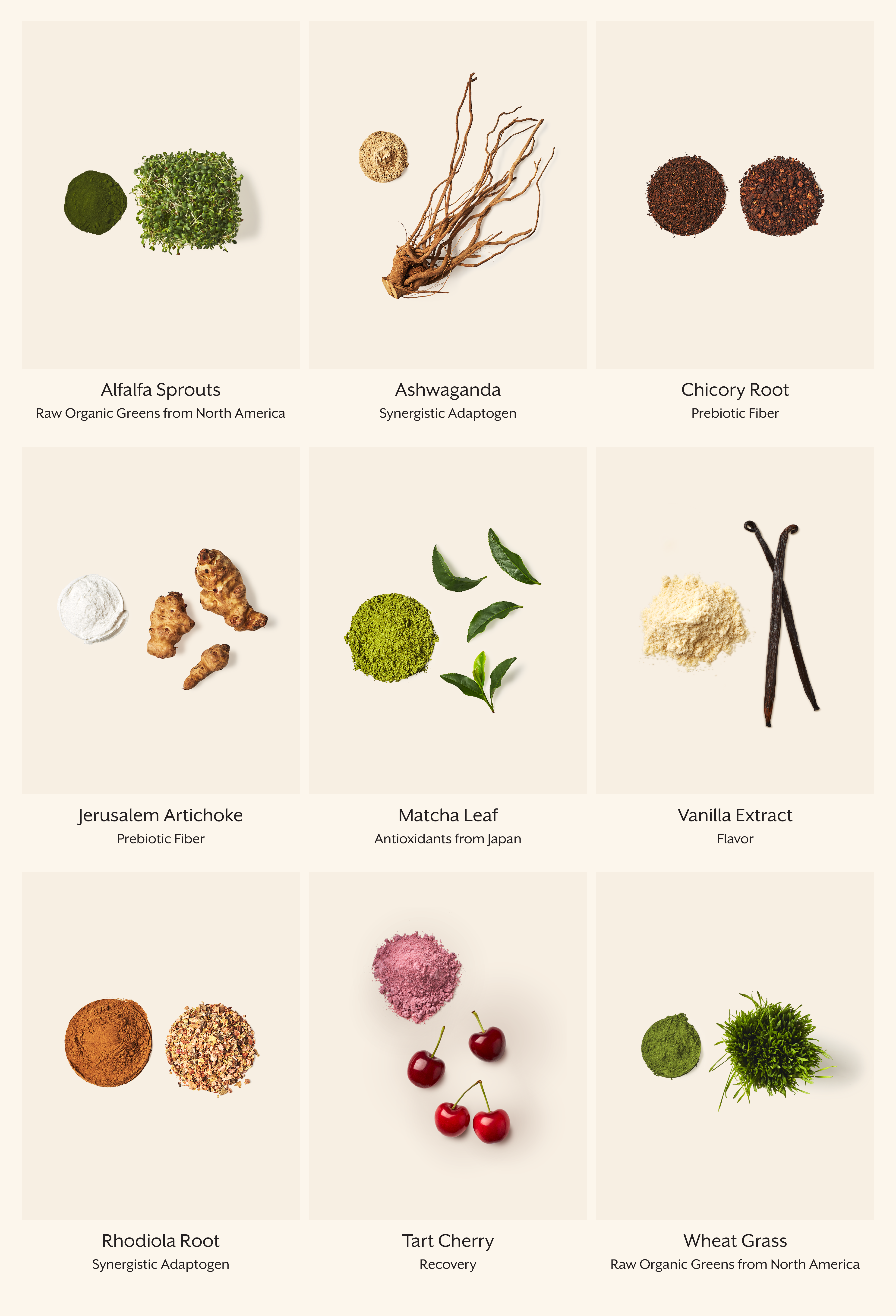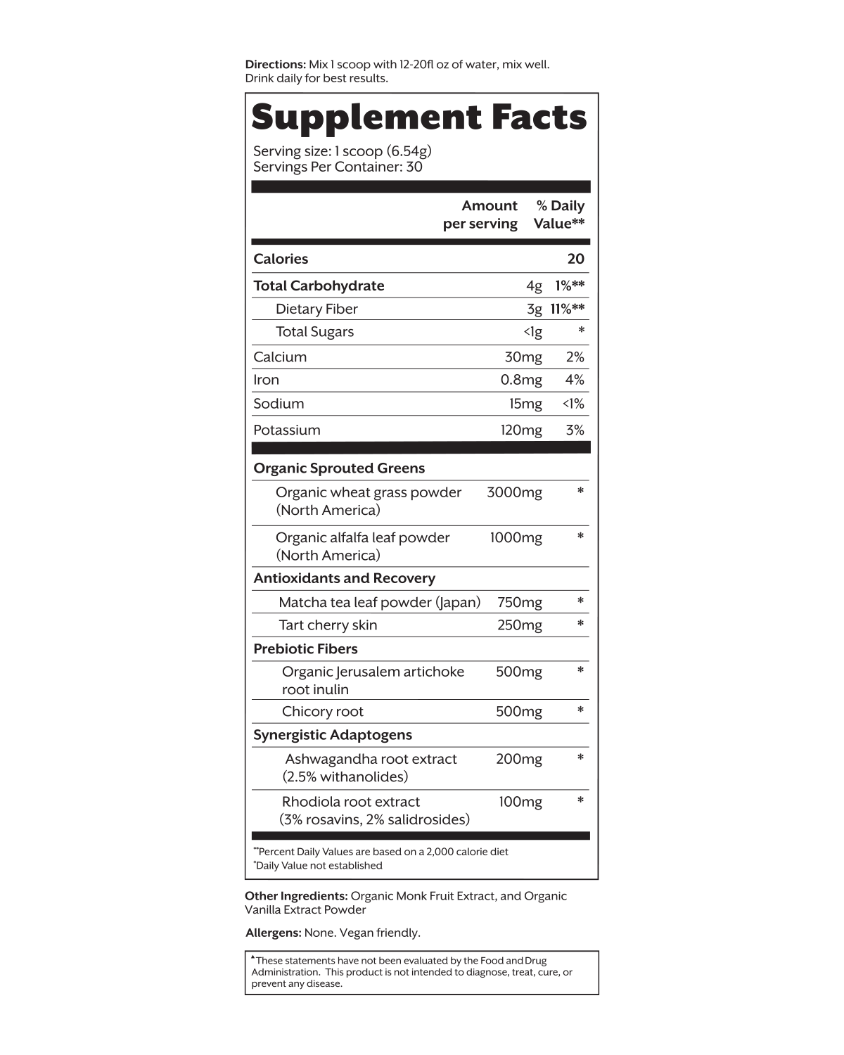 Made with sprouted greens organically grown in North America that are selected for their nutrient density, bioavailability, and digestibility. Japanese matcha leaf and tart cherry skin provide antioxidants and to support post-workout recovery. Prebiotic fibers promote a healthful microbiome, and synergist adaptogens balance stress and aid focus.1