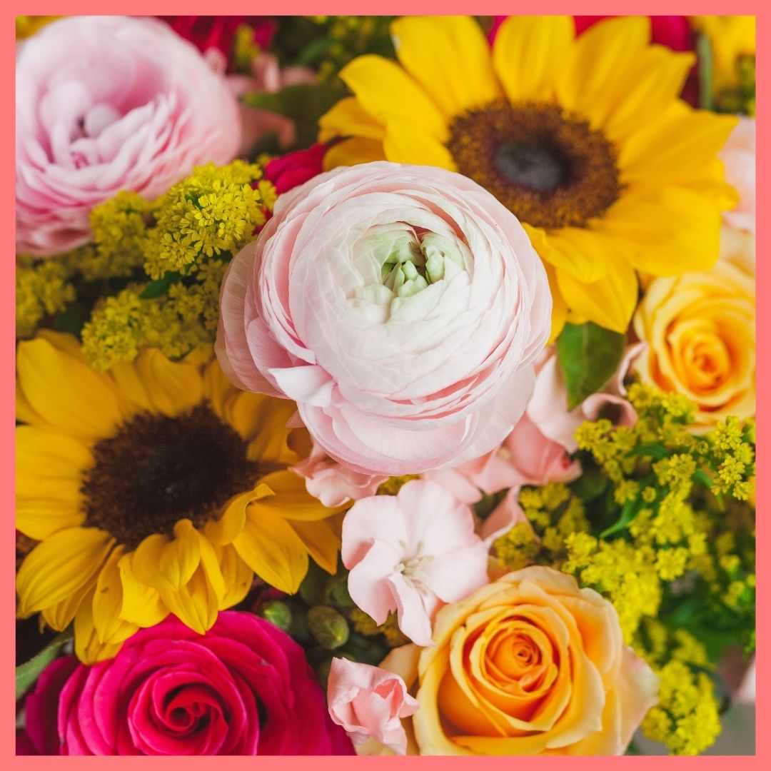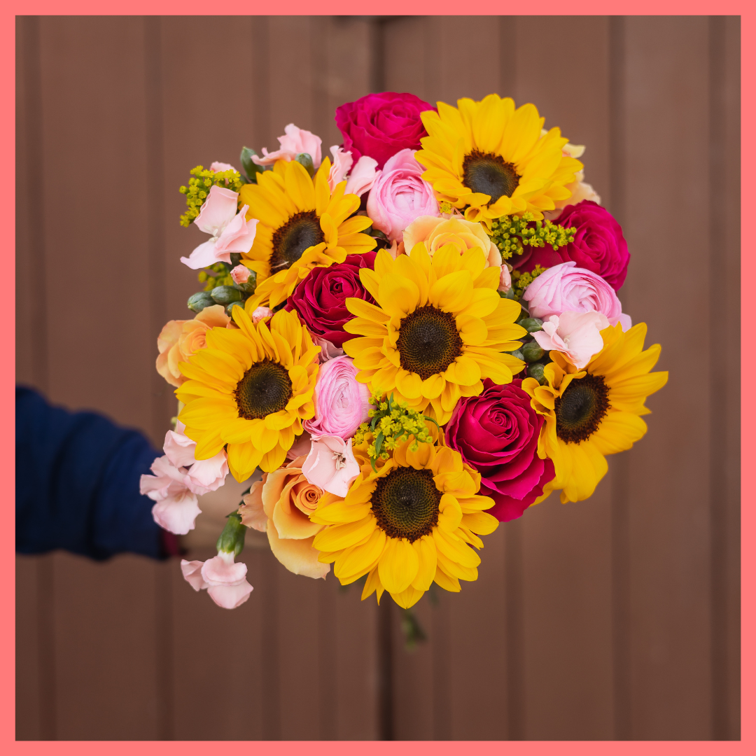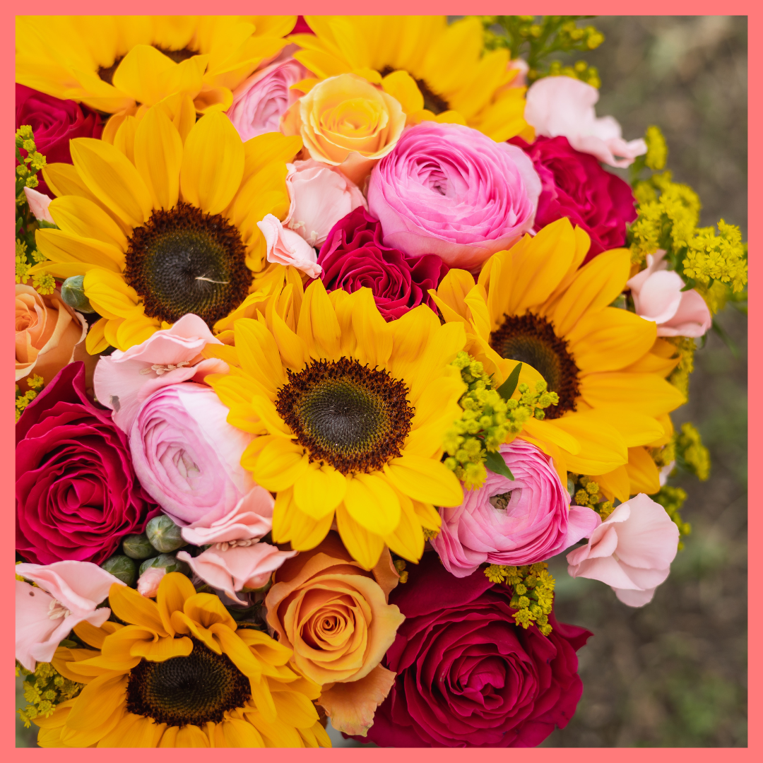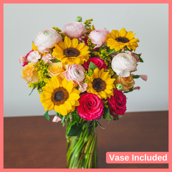 The Thanksgiving Bouquet includes 25 mixed stems of sunflowers, ranunculus, roses, solomio, and solidago. Vase included. Please note that as flowers are a live product, colors and varieties may slightly vary from the photos shown to provide you with the freshest and most beautiful bouquet.