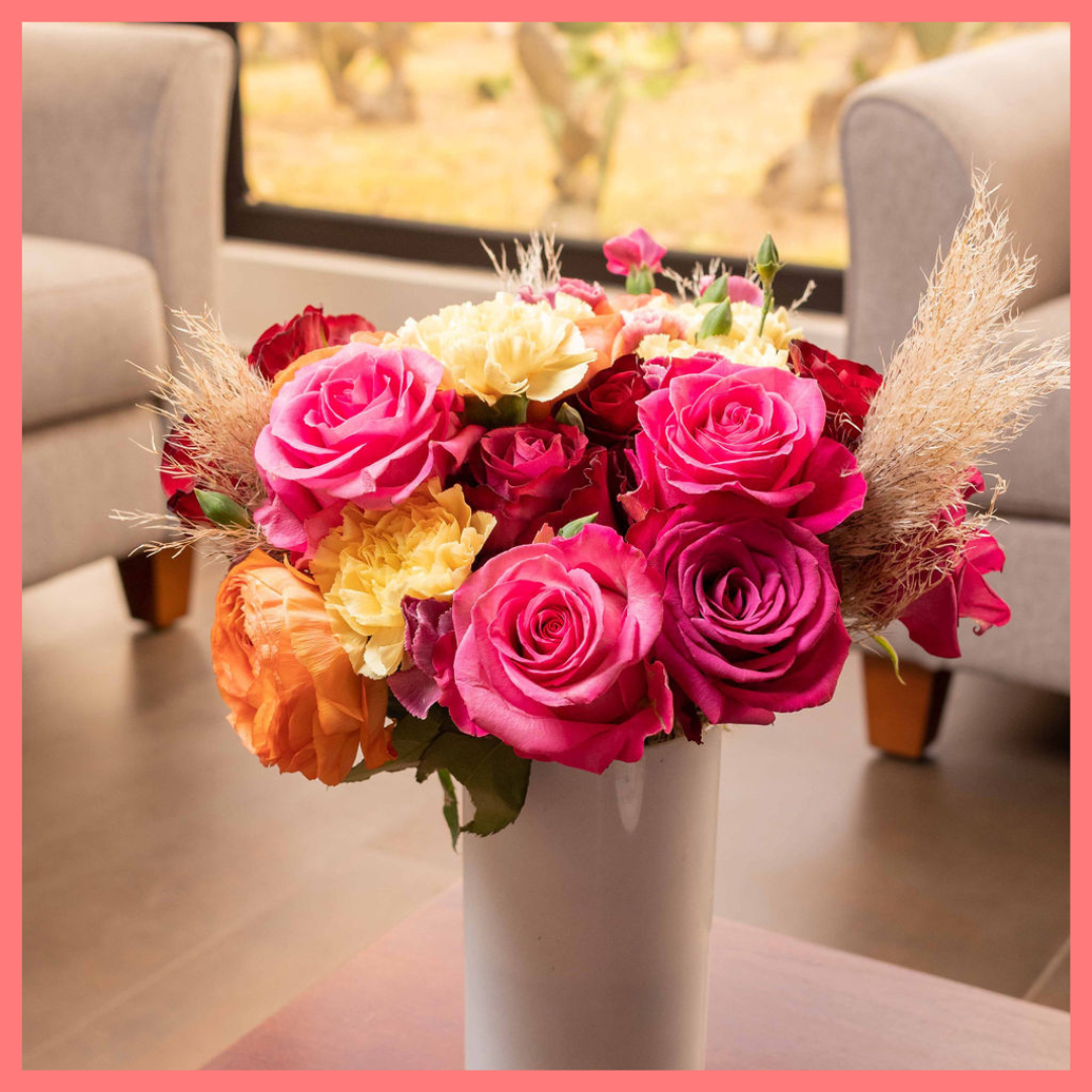 The Thanksgiving Memories bouquet includes 24 mixed stems of roses, ranunculus, carnation, solomio, and dried pampas! Vase included.