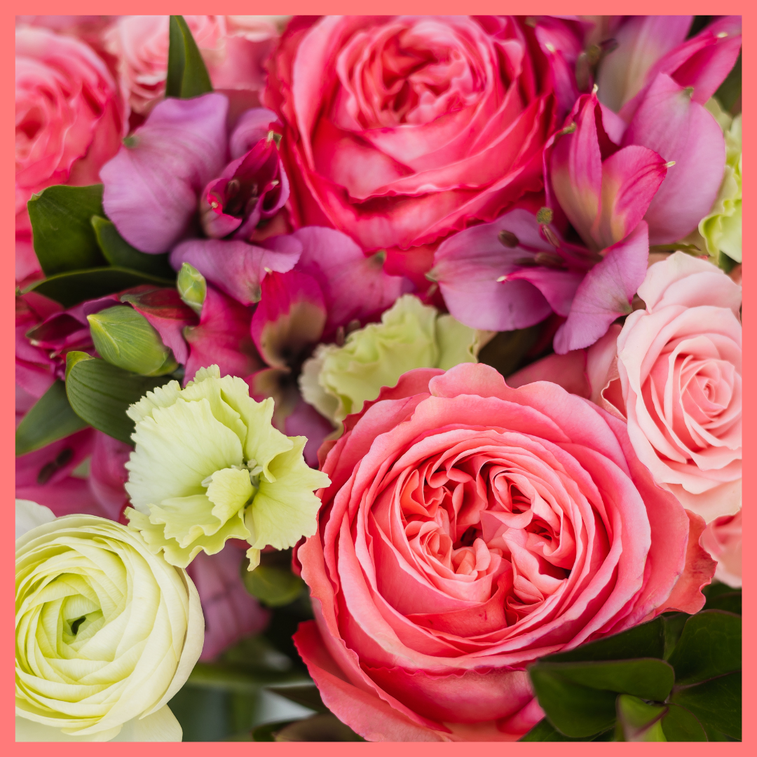 The 365 bouquet includes 38-40 mixed stems of roses, spray roses, solomio, alstroemeria, hebes, and ranunculus. Vase included. Please note that as flowers are a live product, colors and varieties may slightly vary from the photos shown to provide you with the freshest and most beautiful bouquet.