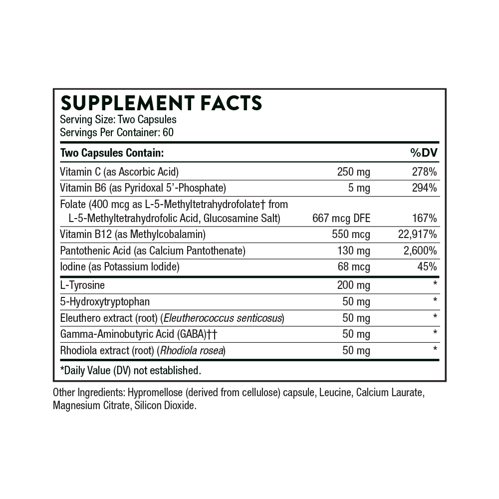 Thorne's Emotion Balance Support is safe and effective for mood enhancement and stress management.* It combines several well-known neurotransmitter-supportive nutrients, including L-tyrosine, 5-HTP, and GABA with two adrenal-supportive botanicals – Rhodiola and Eleutherococcus (a well-known adaptogen that provides general adrenal support.* Emotion Balance Support includes the active forms of folate (5MTHF) and vitamin B12 (methylcobalamin) to support healthy neurological function and mood.*