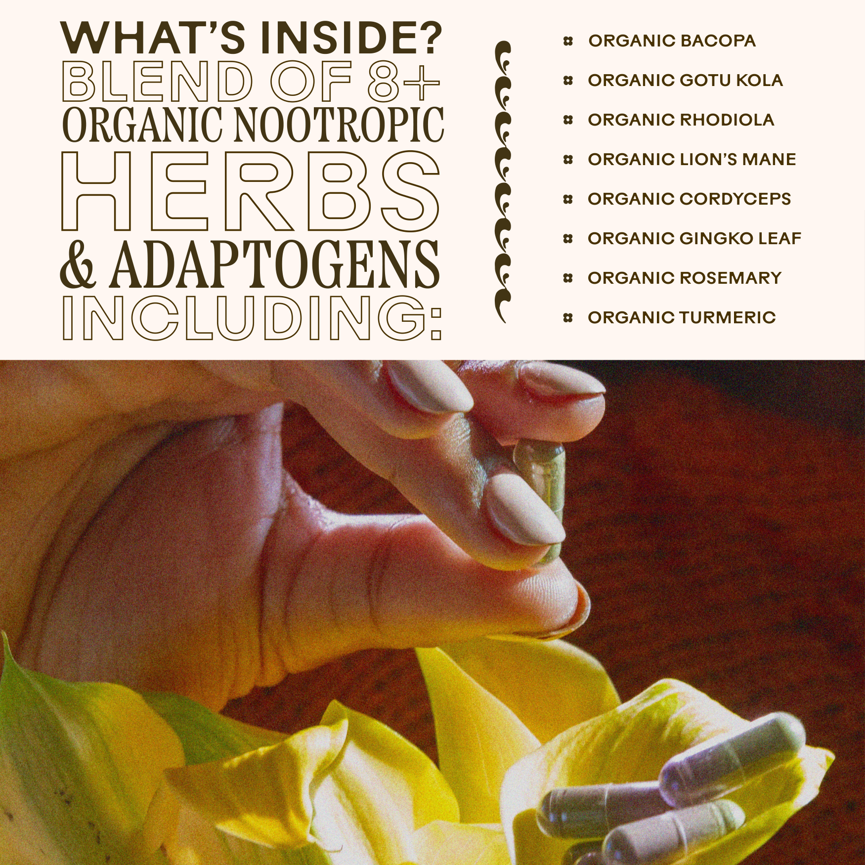 Brain Bloom blends seven nootropic herbs and adaptogens traditionally used to support cognitive function, memory, and mental energy. Adaptogenic herbal blend with Organic Lion’s Mane, Ginkgo, and Bacopa. Whether you’re settling into deep work or seeking more presence in your day, this earthy, herbal powder is your brain’s botanical ally.*