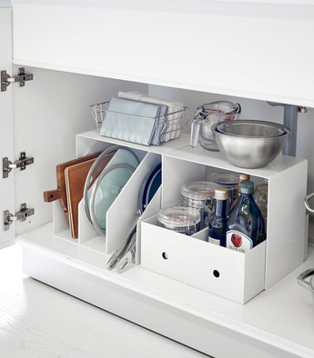 A step up. Introducing an extra-tall version of our super-popular, handy-dandy dish risers. In taller cabinets, space is lost to large pots and pans, which are impossible to stack. This kitchen rack creates a shelf above the pots and pans, reclaiming all that extra space and doubling pot and pan storage potential. We also recommend trying them under the sink to tidy cleaning supplies and other knick knacks.