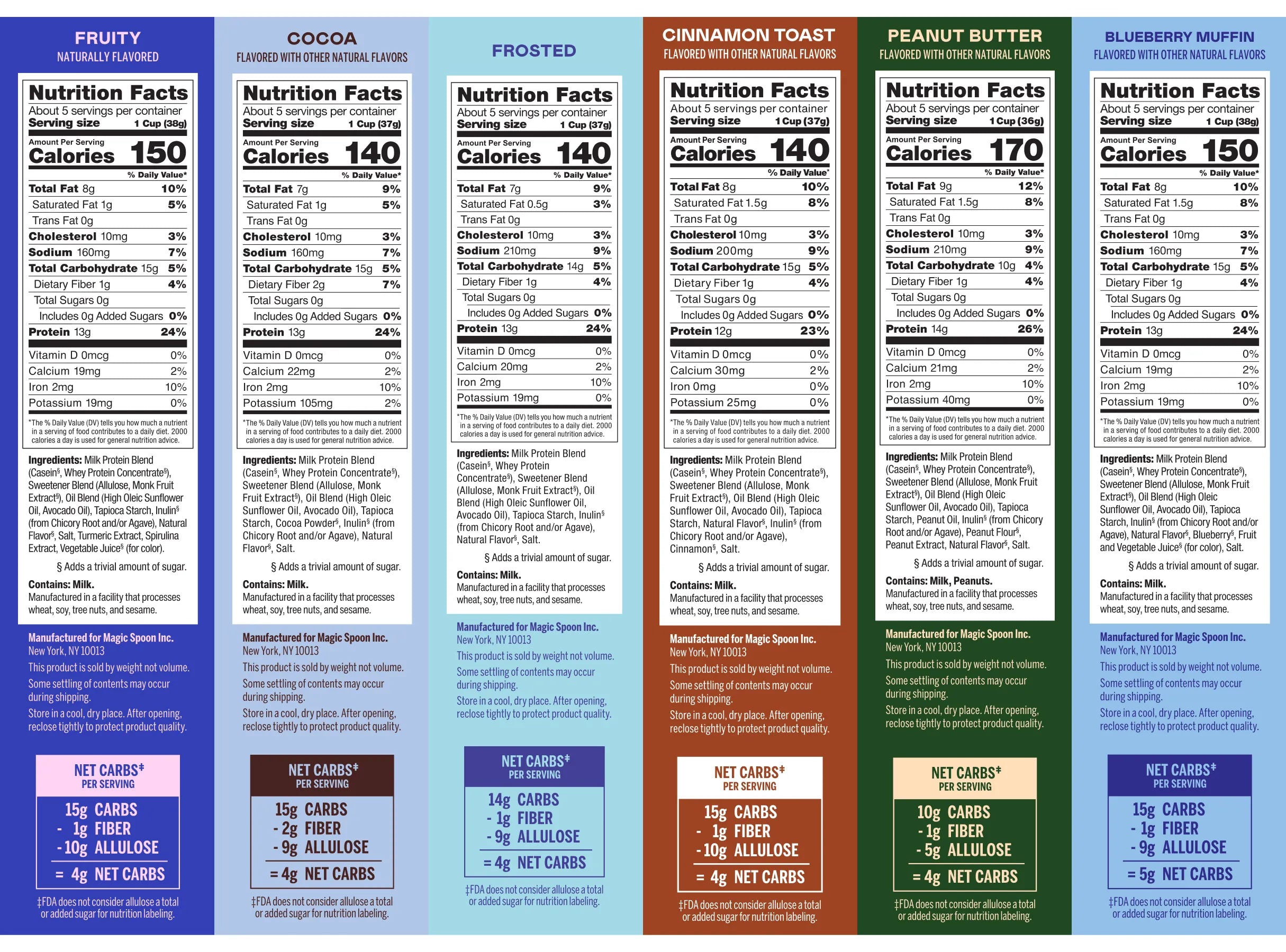 Try all of our classic flavors—Fruity, Frosted, Cocoa, Peanut Butter, Blueberry Muffin, and Cinnamon Toast. We’ve reimagined all your favorite childhood cereals.