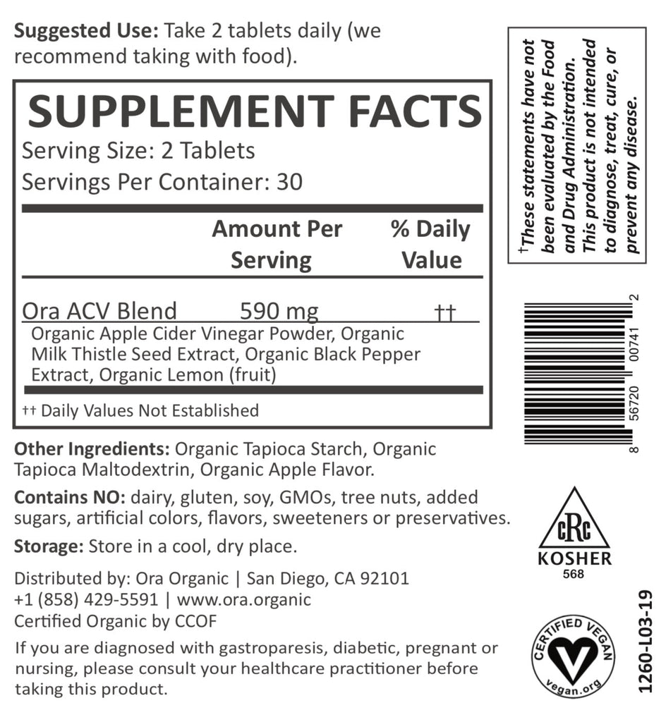 USDA Organic Apple Cider Vinegar Tablets, high in acetic acid and with organic milk thistle seed extract and organic lemon to support the body's detox reaction to unwanted toxins.