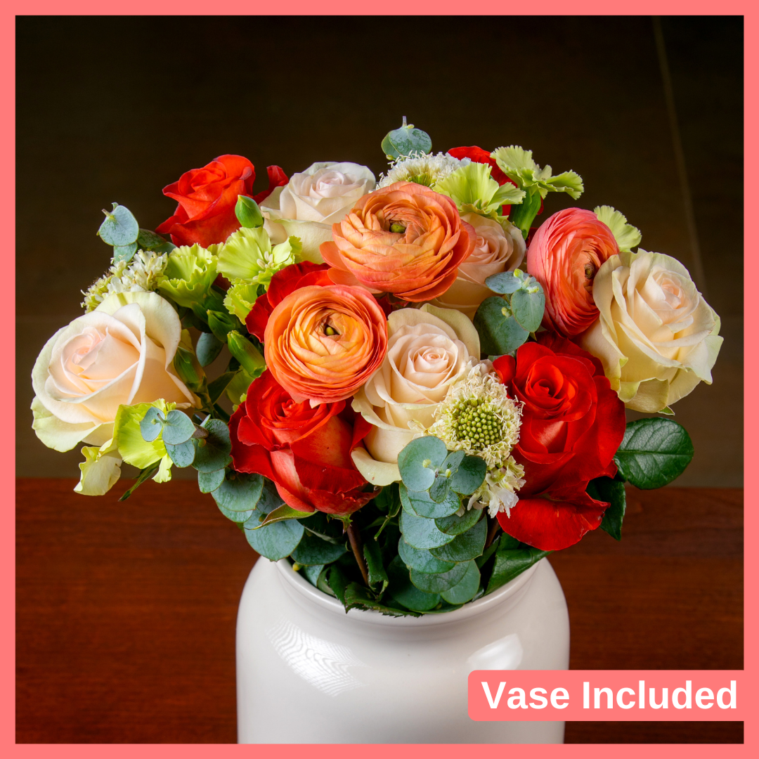 The Celebrate You bouquet includes 24 mixed stems of roses, ranunculus, solomio, and eucalyptus. Vase included. Please note that as flowers are a live product, colors and varieties may slightly vary from the photos shown to provide you with the freshest and most beautiful bouquet.