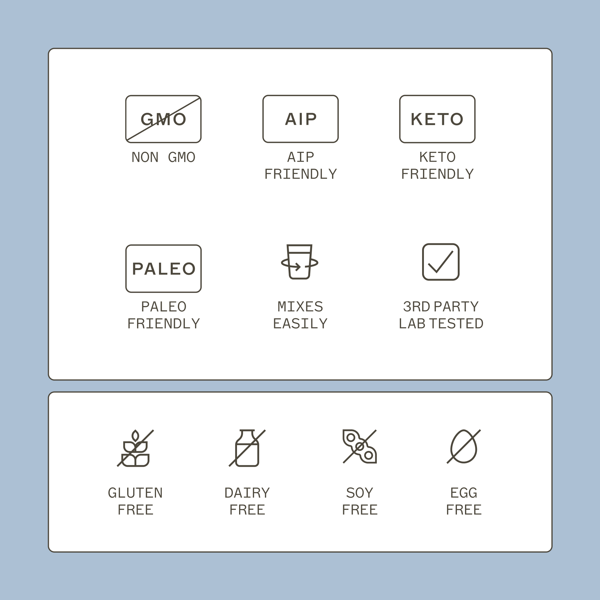 DOES NOT CONTAIN: Gluten, Wheat, Dairy, Corn, Soy, GMOs, or Yeast.