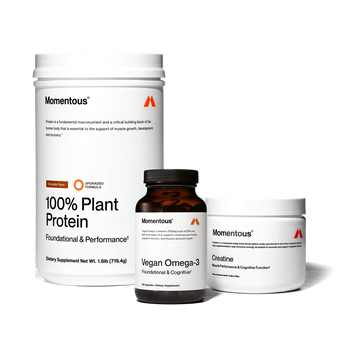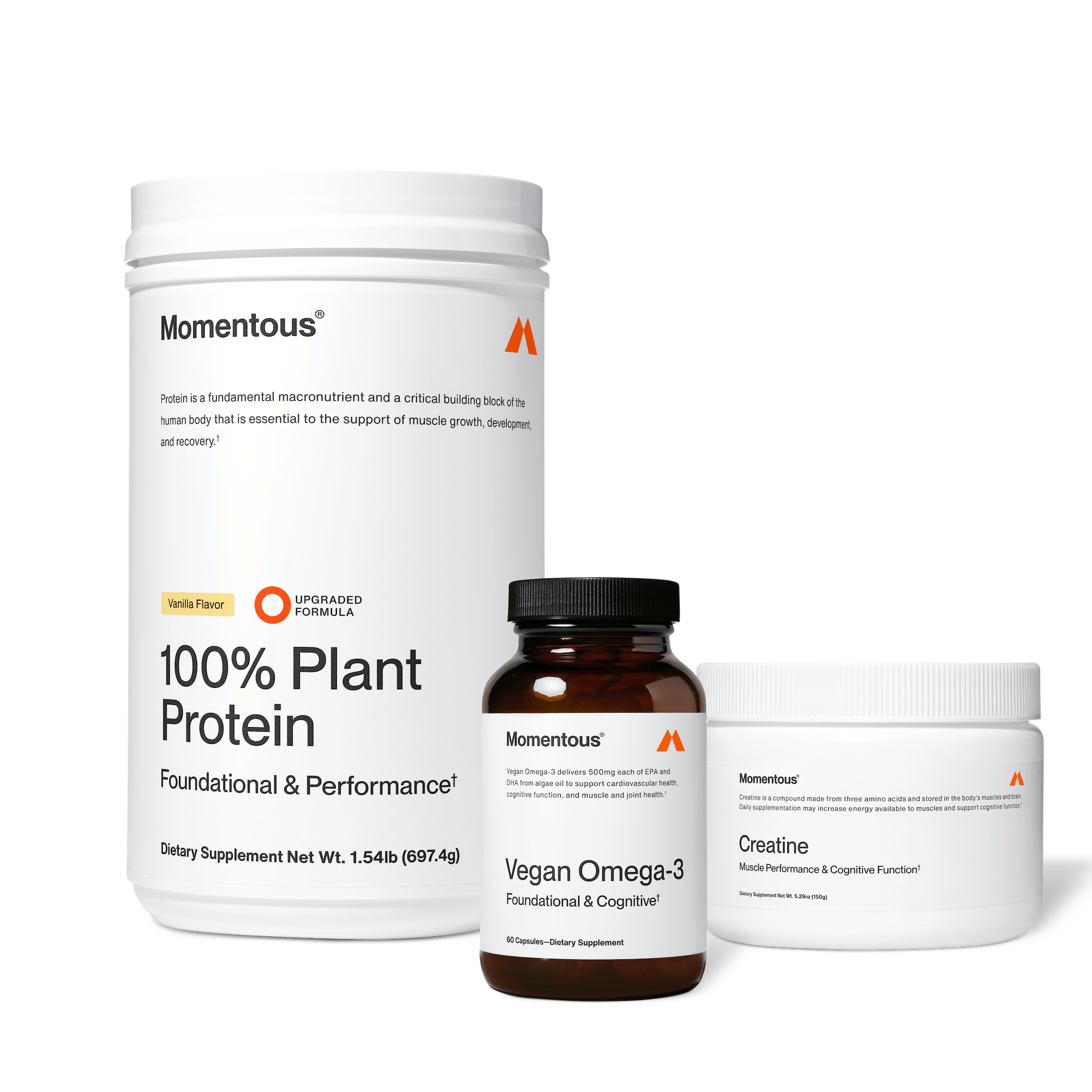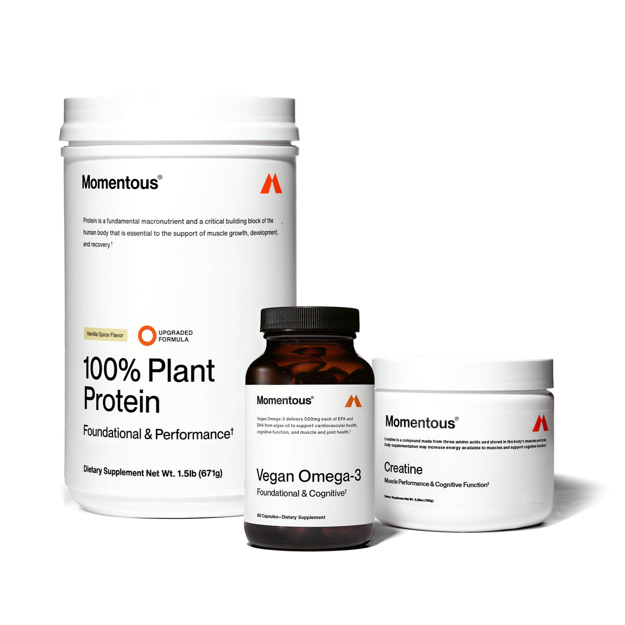 The Momentous Three™: Protein, Creatine, and Omega-3—the 3 nutrients Momentous’ expert ecosystem identified as daily non-negotiables and the biggest impact drivers for longevity of performance and overall health. Each product was developed to meet The Momentous Standard™ of quality, efficacy, and transparency, so you can focus your energy on your goals. Taken daily, this protocol supports muscle strength, growth, and recovery, as well as cognitive function including focus, mental sharpness, and memory recall.